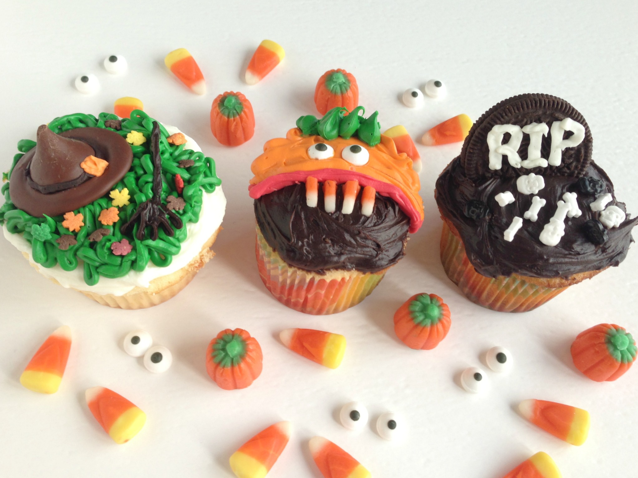 Most families spend the weeks before Halloween up to their shoulders in pumpkin guts. I prefer frosting and candy. Pumpkin carving is awesome, but my family’s go-to Halloween tradition is decorating cupcakes. Don’t be fooled–-it’s just as messy as carving pumpkins, but it’s a lot more fun licking frosting from your fingers than pumpkin innards. This tradition began several years ago when my mother mailed us a package of Halloween-themed goodies–napkins, cups, candy and cupcake liners. I just had to use those cupcake liners…and the rest is history. This is where our creativity flourishes. After all, we have 24 chances to decorate the perfect treat with designs running the gamut from cutesy (mine), to imaginative (both Jay and Jake) to downright gross (like Jay’s bleeding witch, crushed by her own hat). Disgusting or adorable, they all taste delicious!